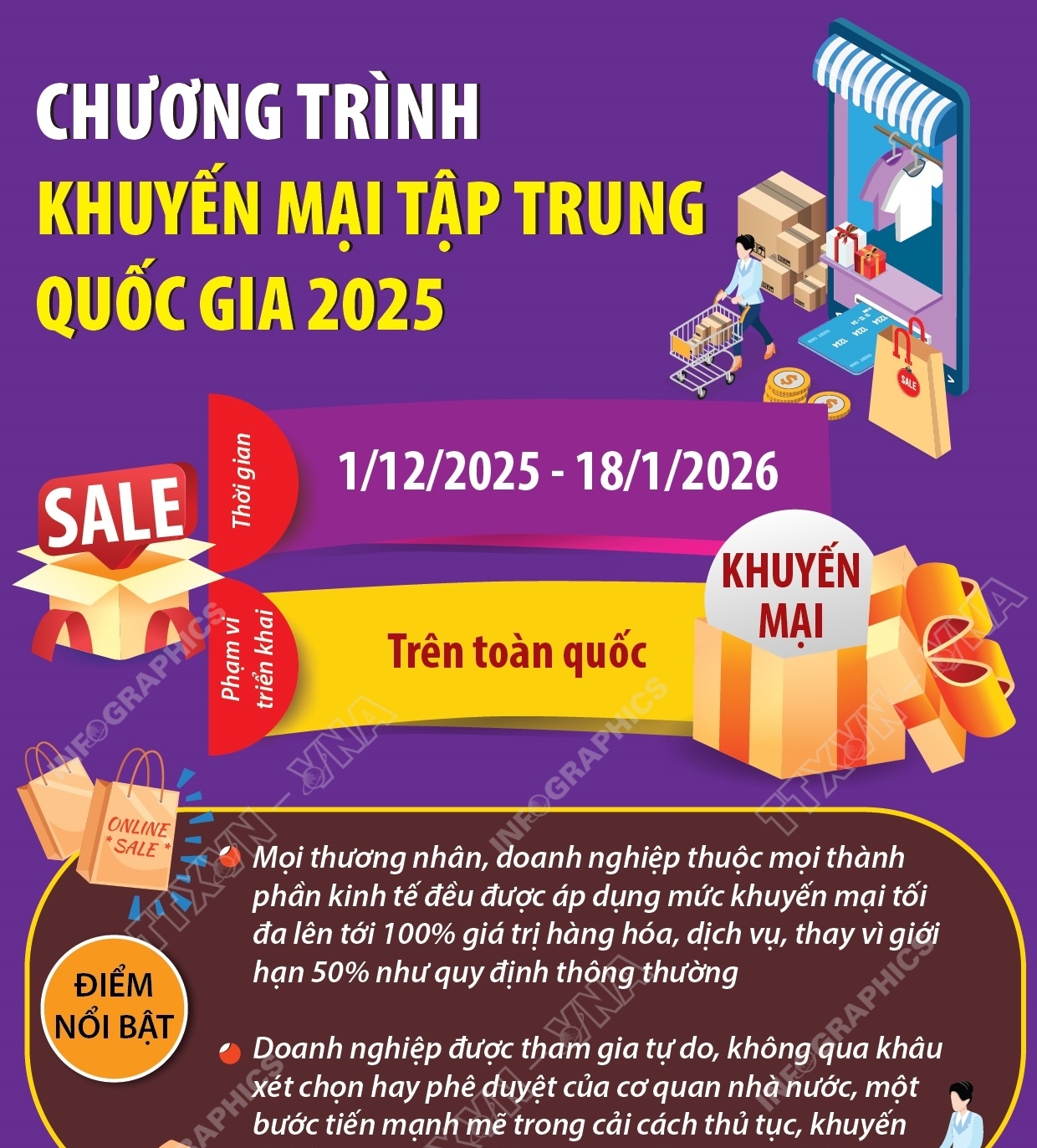 Hà Nội (TTXVN 4/12) Chương trình Khuyến mại tập trung quốc gia 2025 - Vietnam Grand Sale 2025, thực hiện Chỉ thị số 18/CT-TTg ngày 18/6/2025 của Thủ tướng Chính phủ về việc đẩy mạnh xúc tiến thương mại và phát triển thị trường trong nước. Chương trình diễn ra từ 1/12/2025 đến hết 18/1/2026, bao trùm giai đoạn mua sắm cao điểm trước Tết Dương lịch và Tết Nguyên đán, với phạm vi triển khai trên toàn quốc.