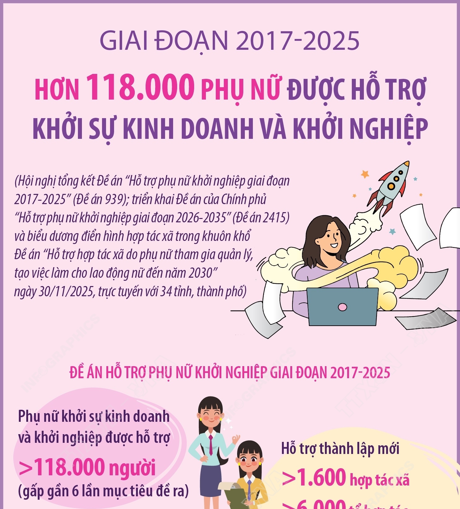 Hà Nội (TTXVN 2/12) Đề án hỗ trợ phụ nữ khởi nghiệp giai đoạn 2017-2025 được triển khai đồng bộ, hiệu quả, có tính bền vững, đạt và vượt tất cả mọi mục tiêu. Đề án đã nâng cao nhận thức, khơi dậy khát vọng, truyền cảm hứng, tạo nên một phong trào khởi nghiệp sâu rộng trong phụ nữ; hỗ trợ thiết thực về vốn, kiến thức, kỹ năng, giúp hàng trăm nghìn phụ nữ tự tin tham gia khởi nghiệp, khởi sự kinh doanh. Chất lượng các dự án khởi nghiệp ngày càng được nâng cao. Nhiều dự án được phát triển thành doanh nghiệp, hợp tác xã, tổ hợp tác bền vững, tạo việc làm cho hàng chục nghìn lao động nữ. Theo đó, đề án đã hỗ trợ hơn 118.000 phụ nữ khởi sự kinh doanh và khởi nghiệp (gấp gần 6 lần so với mục tiêu đề ra); hỗ trợ thành lập mới hơn 1.600 hợp tác xã và hơn 6.000 tổ hợp tác do phụ nữ tham gia quản lý, điều hành (đạt hơn 6,6 lần so với mục tiêu); hơn 130.000 doanh nghiệp nữ mới thành lập được tư vấn, hỗ trợ (đạt 1,3 lần so với mục tiêu); hơn 2.400 tỷ đồng vốn được kết nối qua ngân hàng, quỹ hỗ trợ, tài chính vi mô; trên 1.800 cuộc thi và ngày hội phụ nữ khởi nghiệp, thu hút hơn 41.000 ý tưởng sáng tạo, tạo hiệu ứng lan tỏa mạnh mẽ với nhiều dự án đã vươn ra thị trường quốc tế (nông sản sạch, OCOP...).
