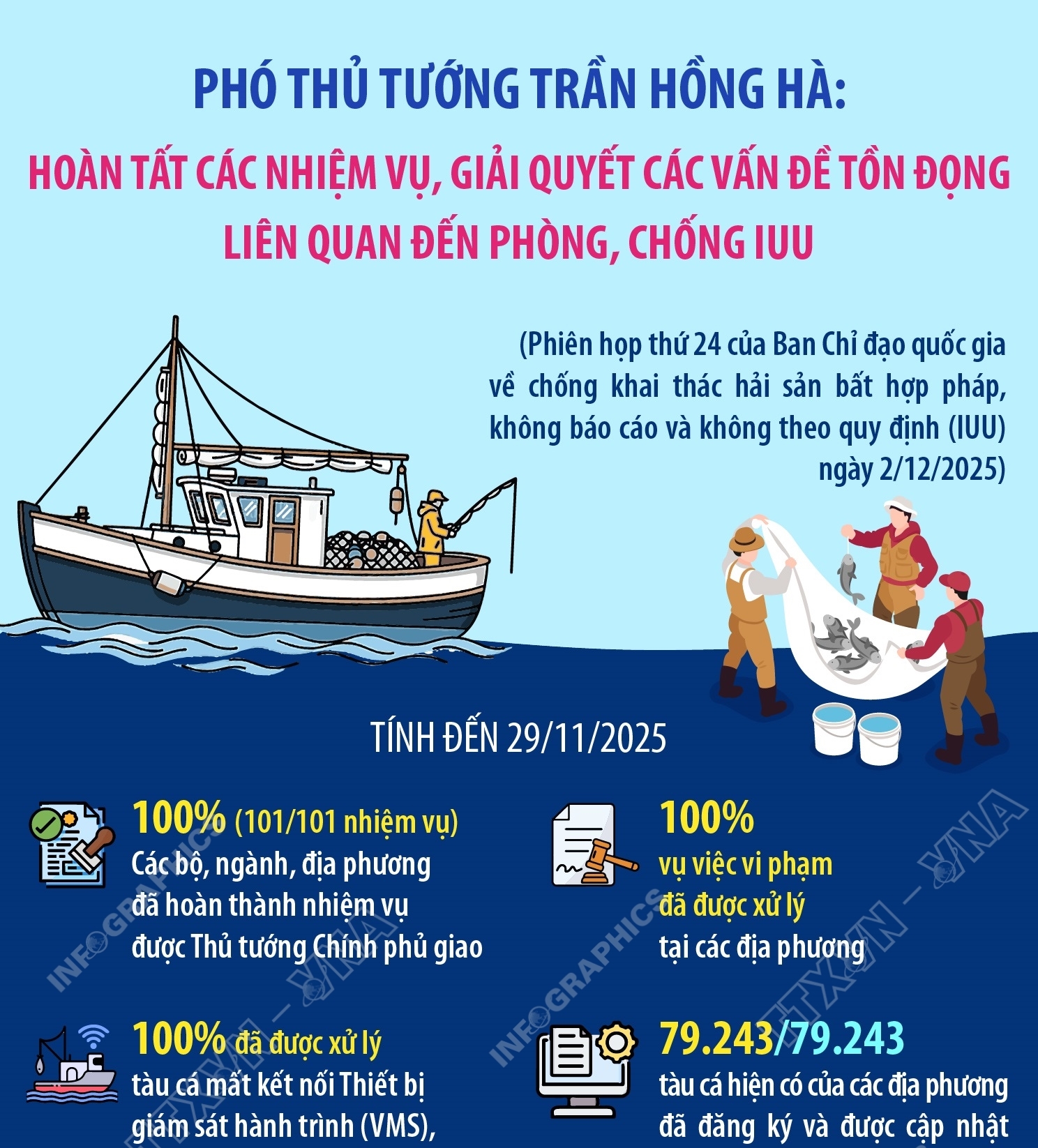 Hà Nội (TTXVN 2/12) Ngày 2/12/2025, Phó Thủ tướng Trần Hồng Hà, Phó trưởng Ban Chỉ đạo quốc gia về chống khai thác hải sản bất hợp pháp, không báo cáo và không theo quy định (IUU) chủ trì Phiên họp lần thứ 24 của Ban Chỉ đạo, kết nối trực tuyến với 21 tỉnh, thành phố ven biển. Tại phiên họp, Bộ Nông nghiệp và Môi trường cho biết, ngành nông nghiệp đã triển khai quyết liệt các giải pháp chống khai thác IUU. Các địa phương đã xử lý 100% vụ việc vi phạm. 100% tàu cá mất kết nối Thiết bị giám sát hành trình (VMS), vượt ranh giới trên biển đã được xử lý. Tổng số tàu cá hiện có của các địa phương đã đăng ký và được cập nhật trên Cơ sở dữ liệu quốc gia về nghề cá (VNFishbase) là 79.243/79.243 tàu. Kết luận phiên họp, Phó Thủ tướng Trần Hồng Hà nhấn mạnh, từ nay đến 15/12/2025 là thời hạn quan trọng để hoàn tất các nhiệm vụ, giải quyết các vấn đề tồn đọng liên quan đến phòng, chống IUU. Các bộ, ngành liên quan tiếp tục kiểm tra, đánh giá kỹ các số liệu về tàu cá vi phạm, đặc biệt là những tàu bị bắt do khai thác trái phép và xâm phạm lãnh hải nước khác. Đối với các địa phương, Phó Thủ tướng yêu cầu đánh giá hiệu quả việc vận hành Cơ sở dữ liệu quốc gia về nghề cá (VNFishbase), thử nghiệm và bổ sung hướng dẫn cảng tư nhân tham gia quản lý tàu thuyền và chứng nhận. Bên cạnh đó, các địa phương phải sớm trình Chính phủ dự án sinh kế cho chuyển đổi nghề cá, bao gồm ứng dụng công nghệ cao nuôi trồng xa bờ và phát triển nghề dịch vụ, du lịch…