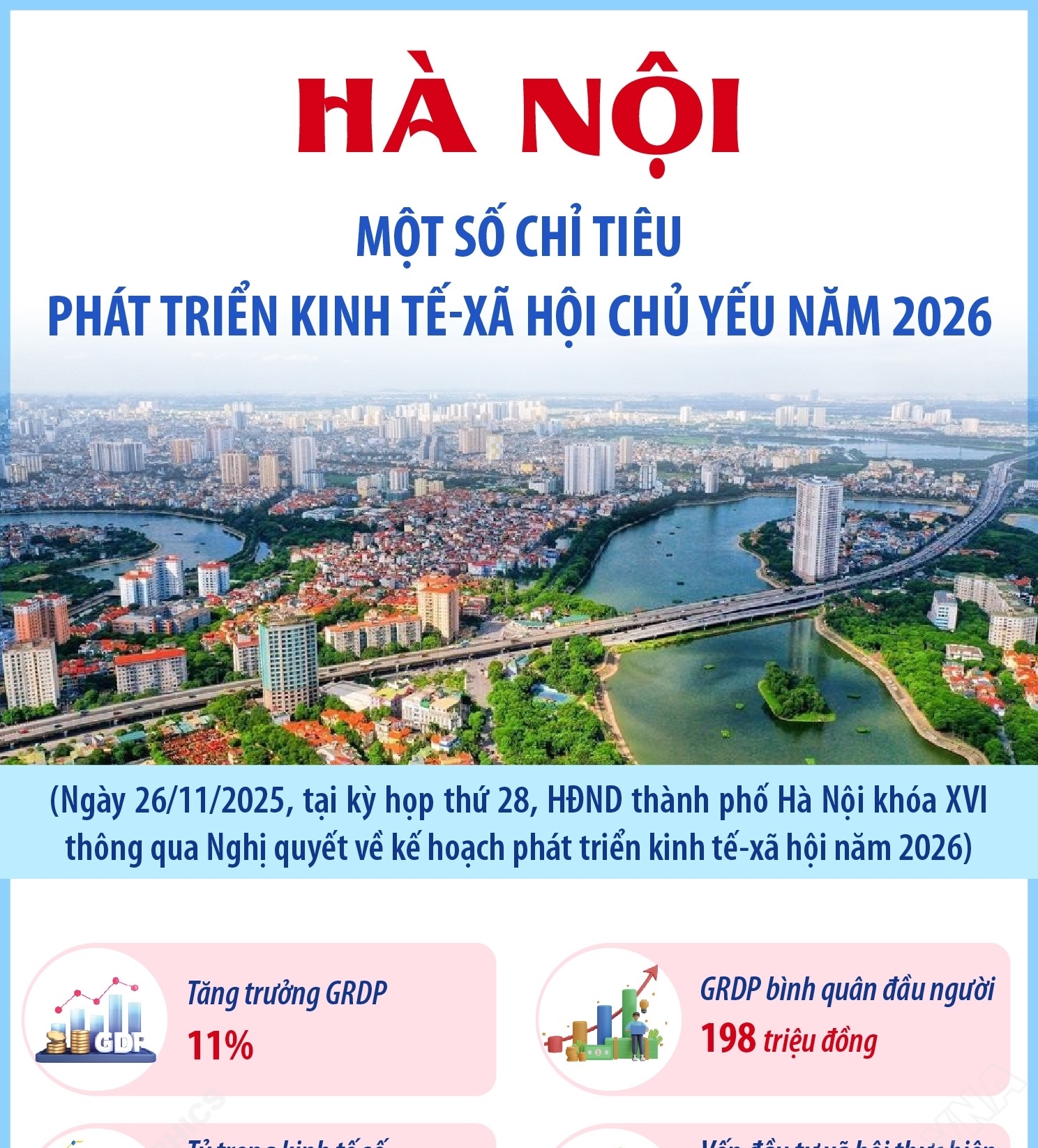 Hà Nội (TTXVN 4/12) Nghị quyết về Kế hoạch phát triển kinh tế-xã hội năm 2026 của thành phố Hà Nội đã được Kỳ họp thứ 28, HĐND thành phố Hà Nội khóa XVI thông qua chiều 26/11/2025. Theo đó, năm 2026, Hà Nội đặt mục tiêu GRDP tăng 11%; GRDP/người 198 triệu đồng; Vốn đầu tư thực hiện 730 nghìn tỷ đồng; Kim ngạch xuất khẩu tăng 12%; Kiểm soát chỉ số giá dưới 4,5% ...