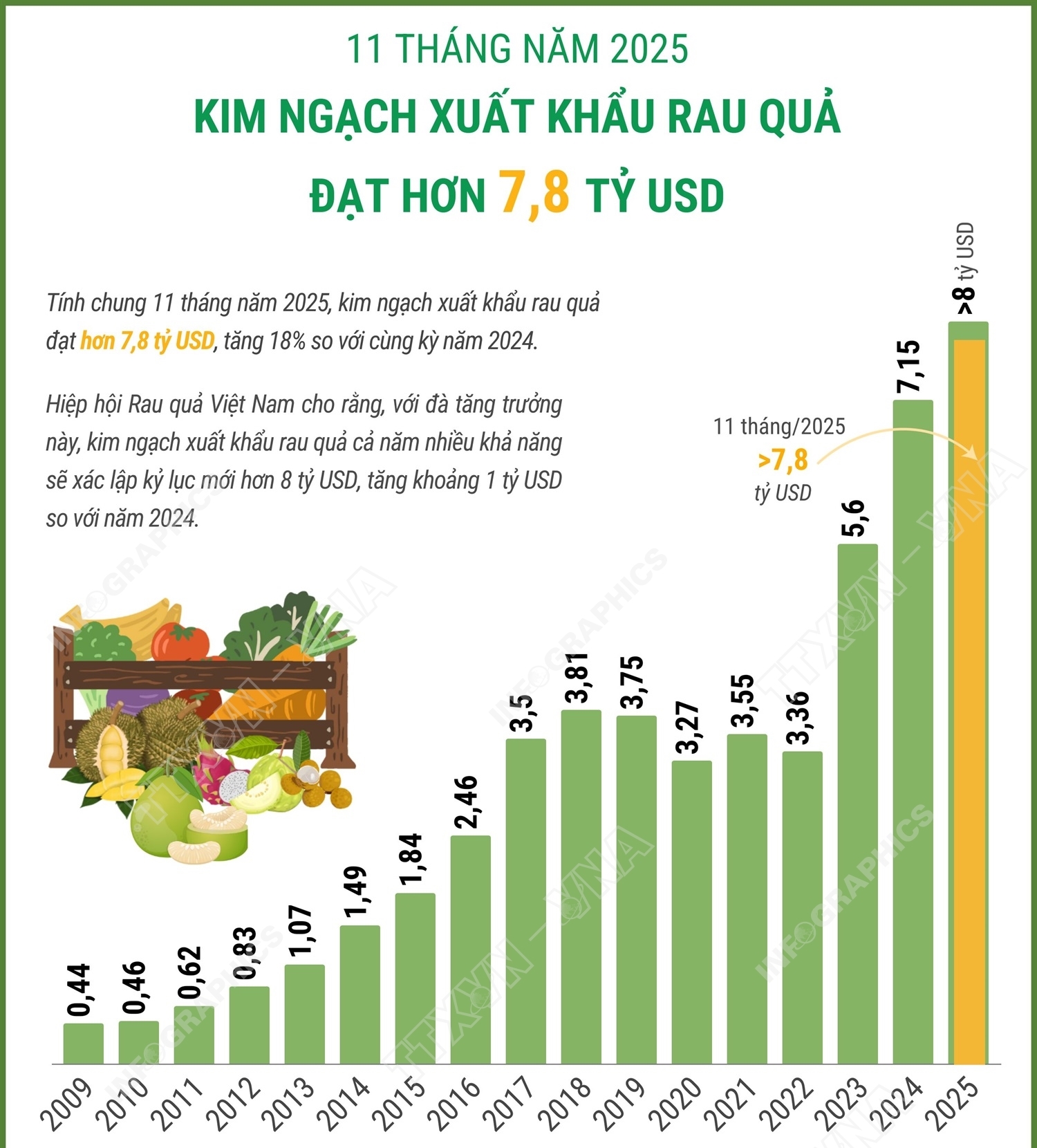 Hà Nội (TTXVN 2/12) Tính chung 11 tháng năm 2025, kim ngạch xuất khẩu rau quả đạt hơn 7,8 tỷ USD, tăng 18% so với cùng kỳ năm 2024. Hiệp hội Rau quả Việt Nam cho rằng, với đà tăng trưởng này, kim ngạch xuất khẩu rau quả cả năm nhiều khả năng sẽ xác lập kỷ lục mới hơn 8 tỷ USD, tăng khoảng 1 tỷ USD so với năm 2024.