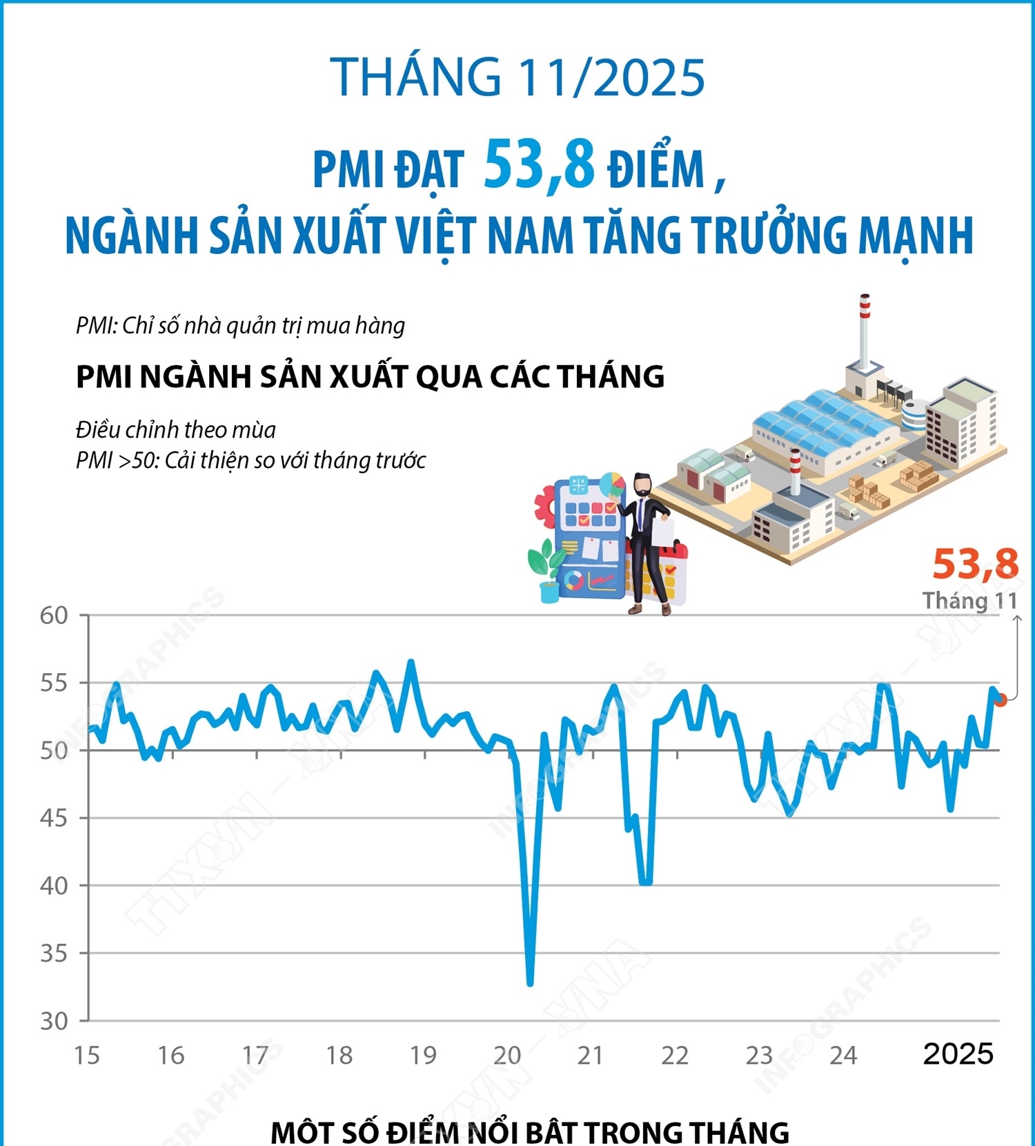 Hà Nội (TTXVN 2/12) Chỉ số PMI (Chỉ số nhà quản trị mua hàng) trong tháng 11/2025 đạt 53,8 điểm, thấp hơn mức 54,5 điểm của tháng 10/2025 nhưng vẫn nằm vững trên ngưỡng 50 điểm. Kết quả này cho thấy, các điều kiện kinh doanh tiếp tục cải thiện và ngành sản xuất duy trì đà hồi phục tháng thứ năm liên tiếp, bất chấp những gián đoạn đáng kể trong chuỗi cung ứng do mưa bão…