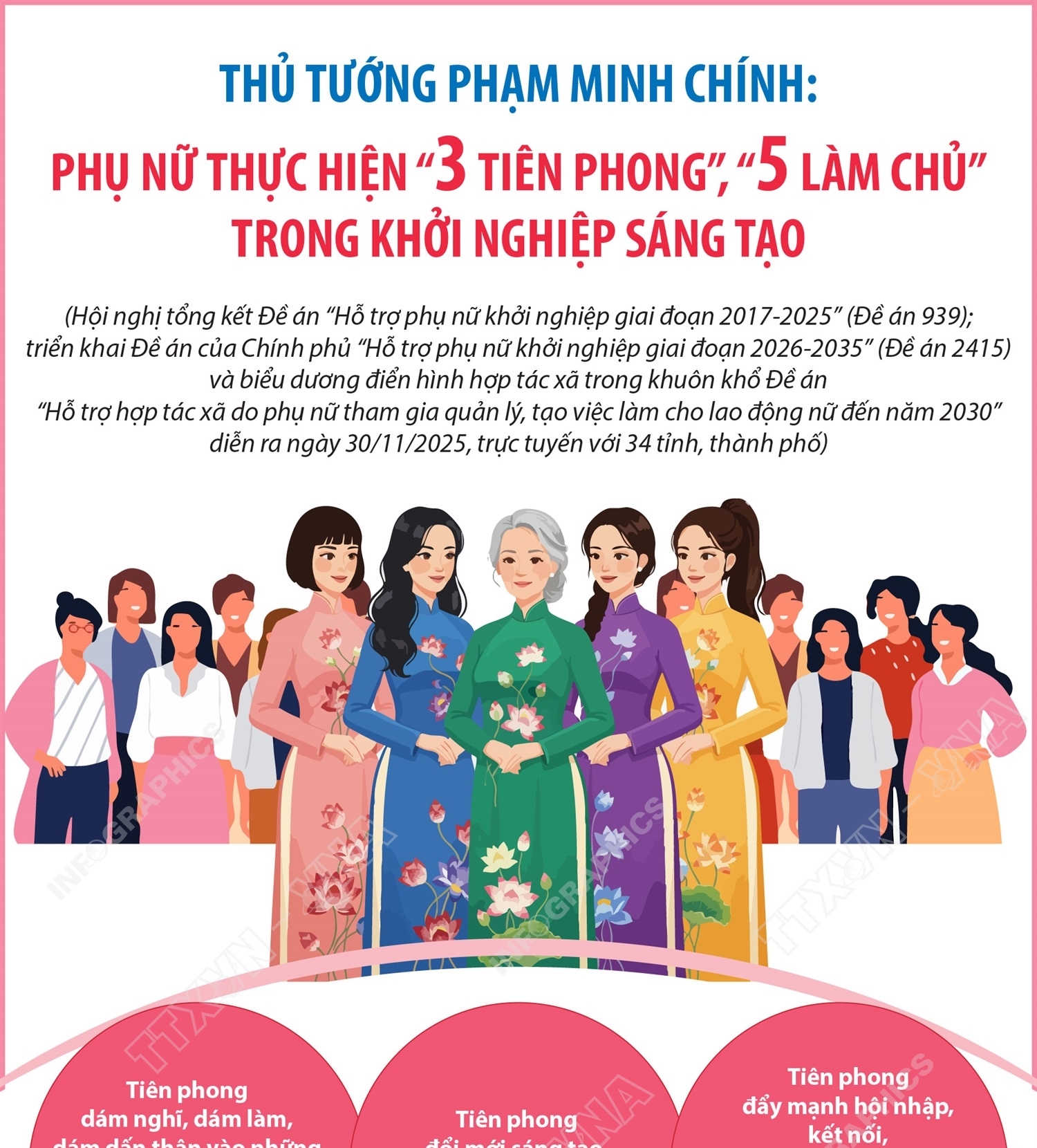Hà Nội (TTXVN 3/12) Tại Hội nghị tổng kết Đề án “Hỗ trợ phụ nữ khởi nghiệp giai đoạn 2017 - 2025” (Đề án 939); triển khai Đề án của Chính phủ “Hỗ trợ phụ nữ khởi nghiệp giai đoạn 2026 - 2035” (Đề án 2415) và biểu dương điển hình hợp tác xã trong khuôn khổ Đề án “Hỗ trợ hợp tác xã do phụ nữ tham gia quản lý, tạo việc làm cho lao động nữ đến năm 2030” diễn ra ngày 30/11/2025, Thủ tướng Chính phủ Phạm Minh Chính đề nghị phụ nữ Việt Nam phát huy tinh thần “3 tiên phong”; “5 làm chủ” trong khởi nghiệp sáng tạo theo tinh thần Đề án 2415. Trong đó “3 tiên phong” gồm: Tiên phong dám nghĩ, dám làm, dám dấn thân vào những lĩnh vực khó, phức tạp, dám vượt qua giới hạn của bản thân mình; Tiên phong đổi mới sáng tạo, tư duy khác biệt, chấp nhận rủi ro; Tiên phong đẩy mạnh hội nhập, kết nối, thích ứng linh hoạt, tuân thủ đạo đức kinh doanh và pháp luật, đóng góp an sinh xã hội. Đồng thời phụ nữ cần thực hiện “5 làm chủ” gồm: Làm chủ tri thức, kỹ năng; Làm chủ khoa học, công nghệ, chuyển đổi số; Làm chủ tài chính và các nguồn lực phát triển; Làm chủ trong quản trị thông minh, tối ưu hóa hiệu quả công việc; Làm chủ thị trường, hệ sinh thái khởi nghiệp và xây dựng thương hiệu doanh nghiệp.