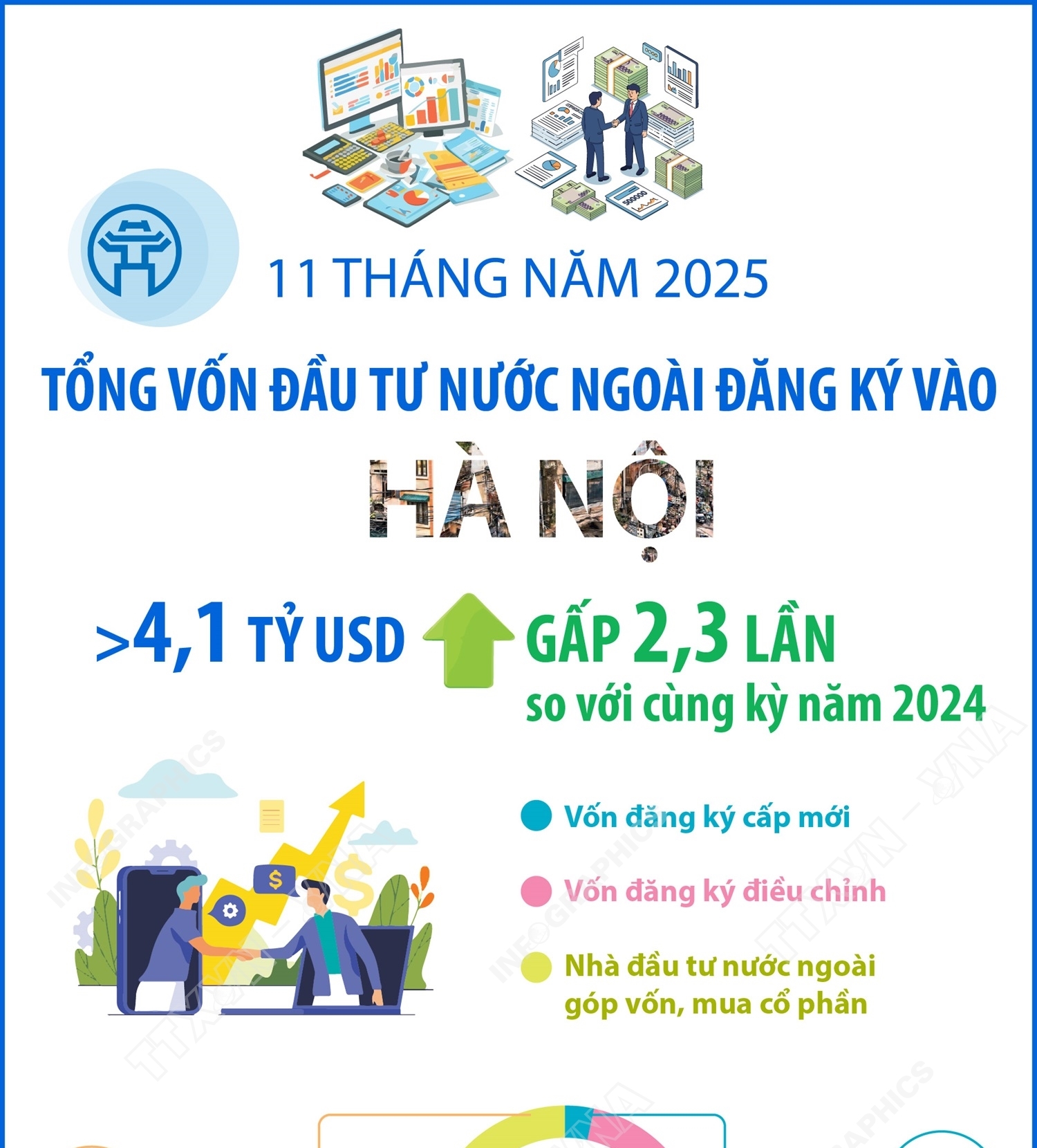 Hà Nội (TTXVN 4/12) 11 tháng năm 2025, vốn đầu tư nước ngoài đăng ký vào Hà Nội đạt 4,128 tỷ USD, gấp 2,3 lần cùng kỳ năm 2024. Trong đó, đăng ký cấp mới 404 dự án với số vốn đạt 333 triệu USD; 137 dự án điều chỉnh tăng, giảm vốn đăng ký đạt 3.308 triệu USD và 380 lượt nhà đầu tư nước ngoài góp vốn, mua cổ phần đạt 487 triệu USD.